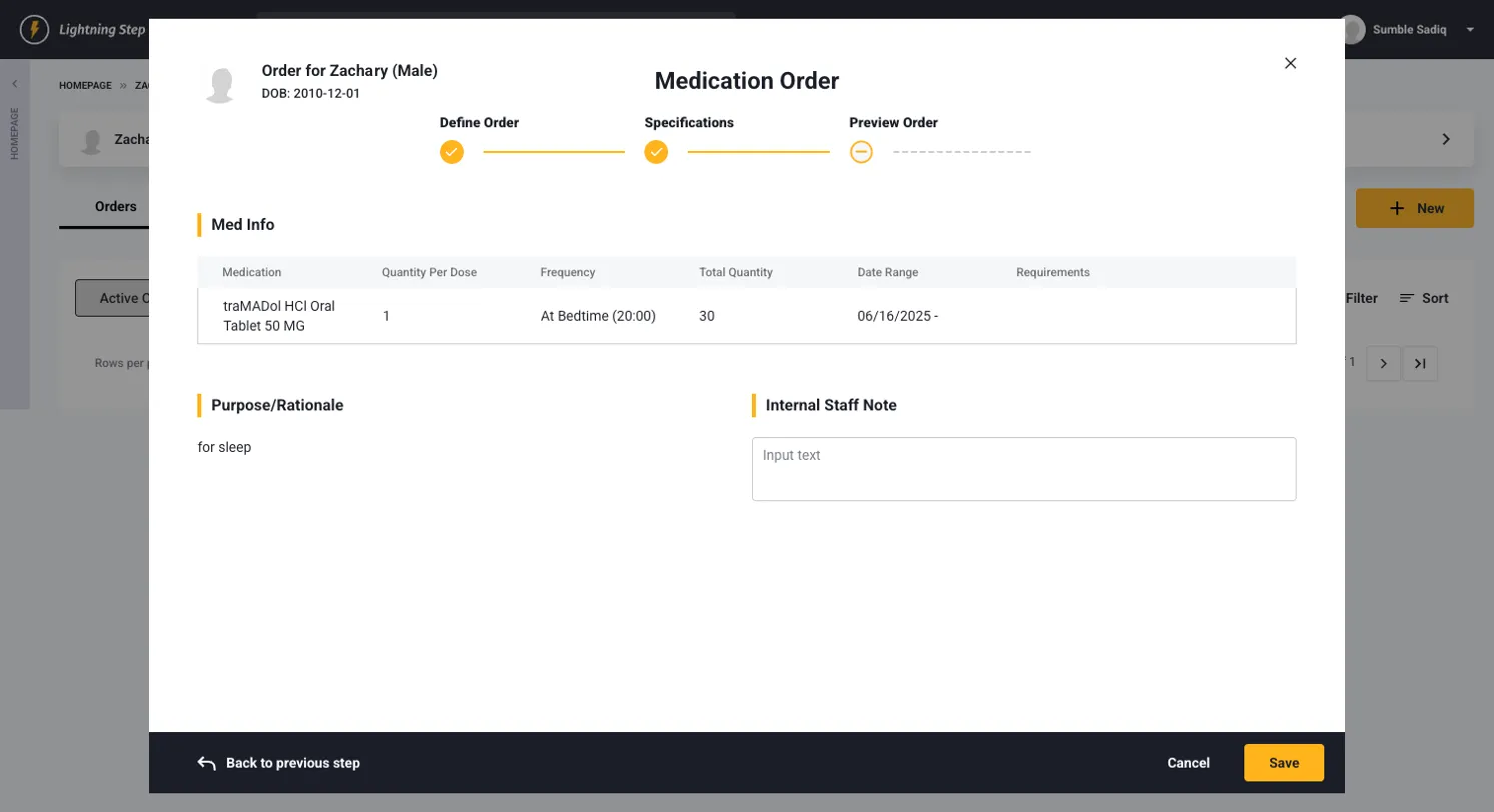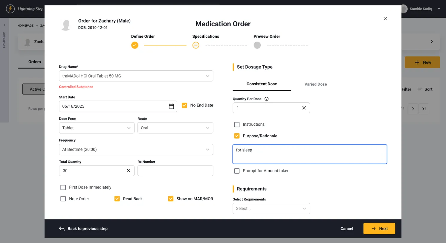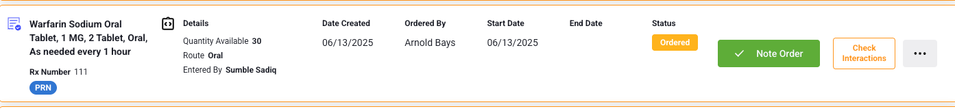 - Order Details: Medication name, dose, route, frequency