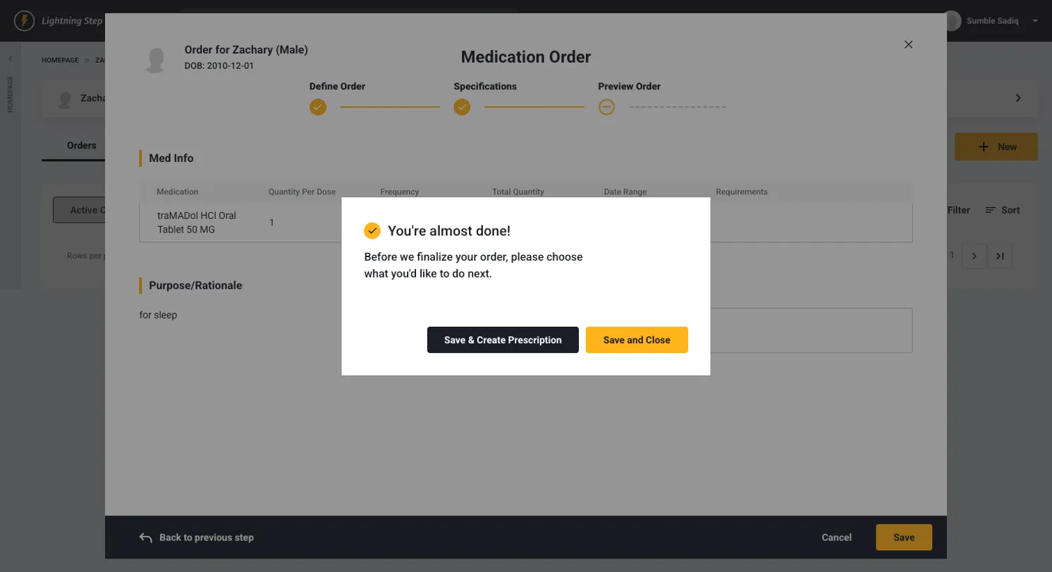 After saving a medication order, you'll see the "You're almost done!" modal: