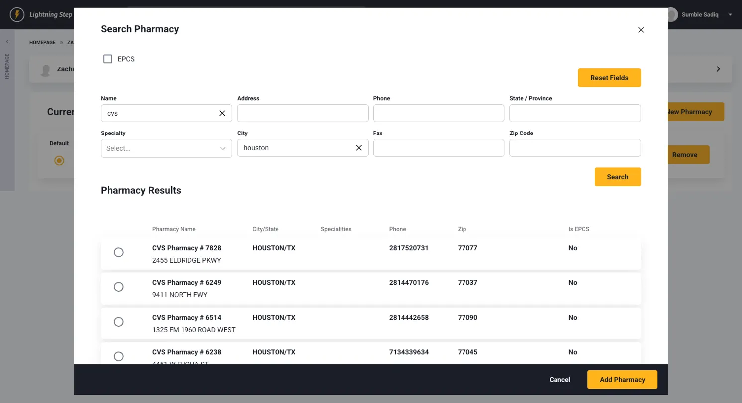 - In the Search Pharmacy modal: