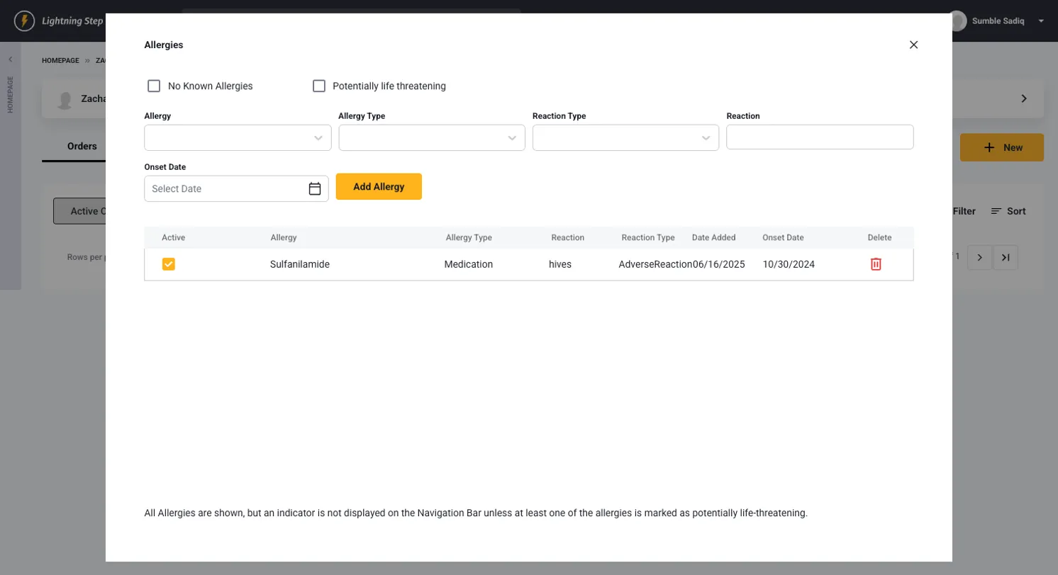 - Manage existing allergies from the same modal