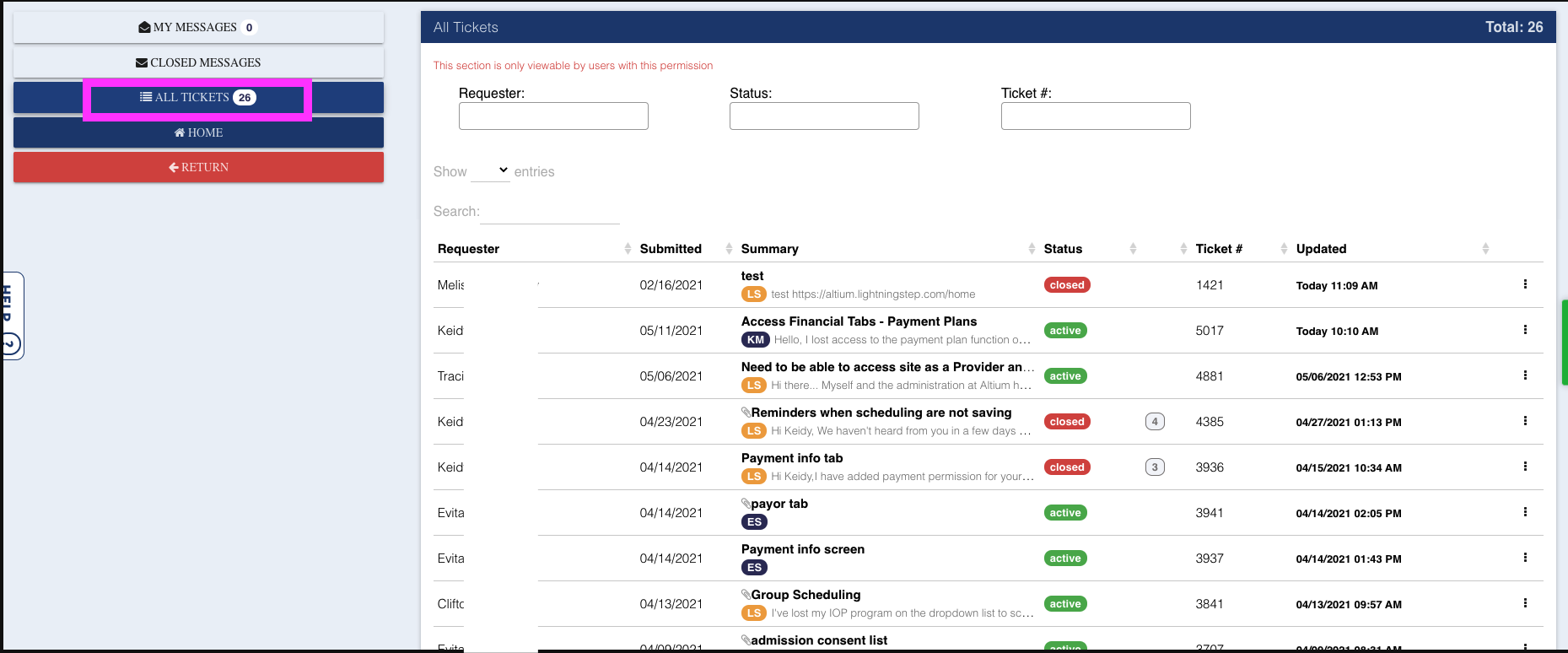 The third tab is only viewable to users who have the permission set up. This is where you can view all tickets submitted by users at your facility.